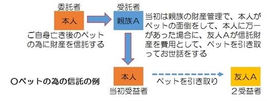 そんなご心配を緩和するために、将来ご自身にもしものことがあった場合、信頼できる方から、お世話をされる方に対してその費用が継続して支払われ、最後まで不自由なくペットが生活出来る様にする、というのが、ペットの為の信託です。